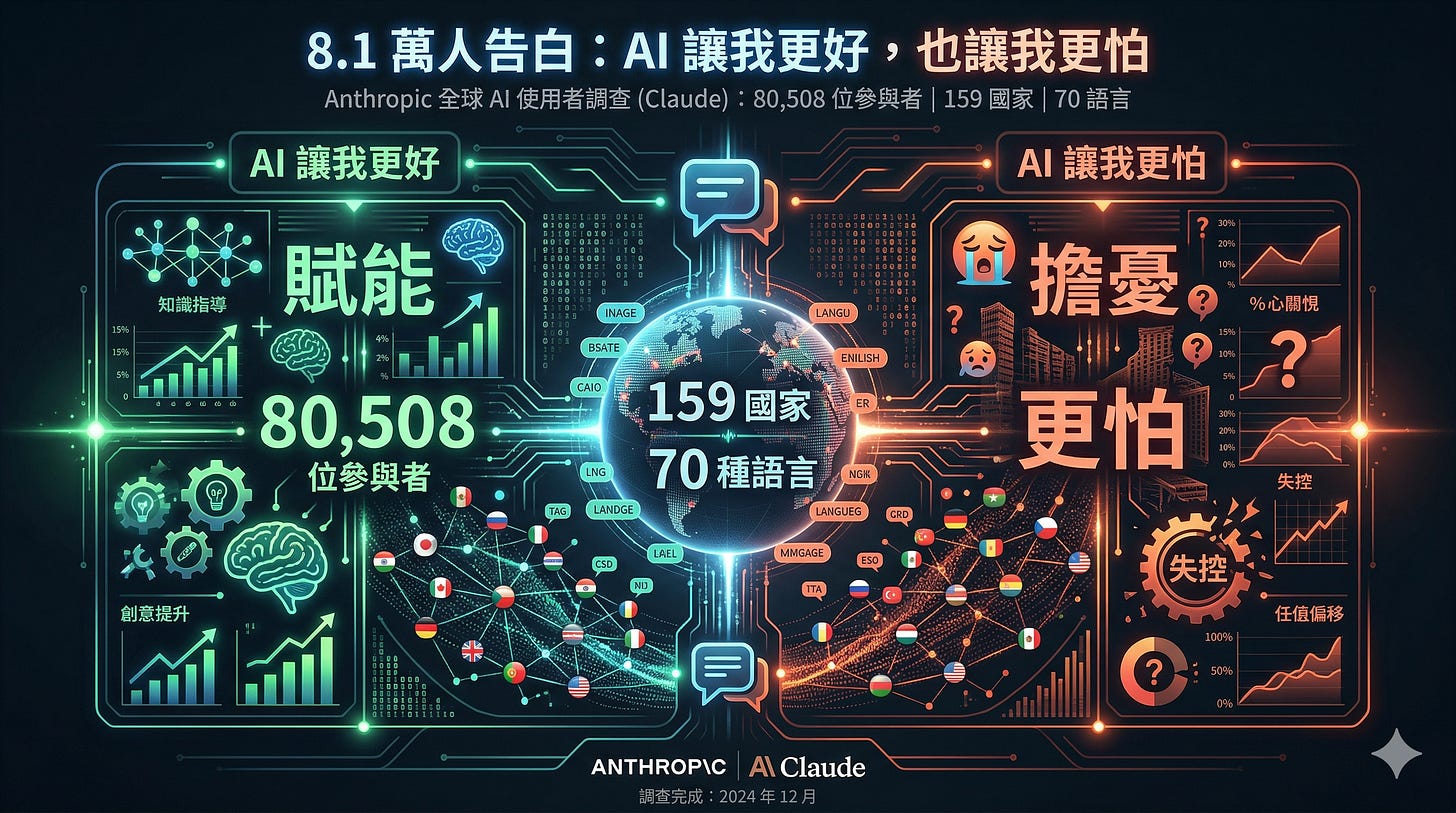 Anthropic 在去年 12 月花了一週,用 AI 訪談工具問了全球 80,508 位 Claude 使用者這個問題。159 個國家、70 種語言。這是人類史上規模最大的質性研究。今天這篇文章,我要告訴你他們得到了什麼答案。
