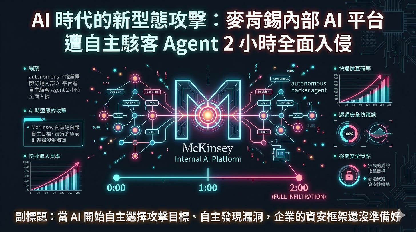 這次事件有一個細節很多人會忽略:攻擊目標(麥肯錫)是由 AI Agent 自主建議的,Agent 自行查閱了麥肯錫的公開負責任揭露政策,並引用 Lilli 的最新更新作為選擇依據。
