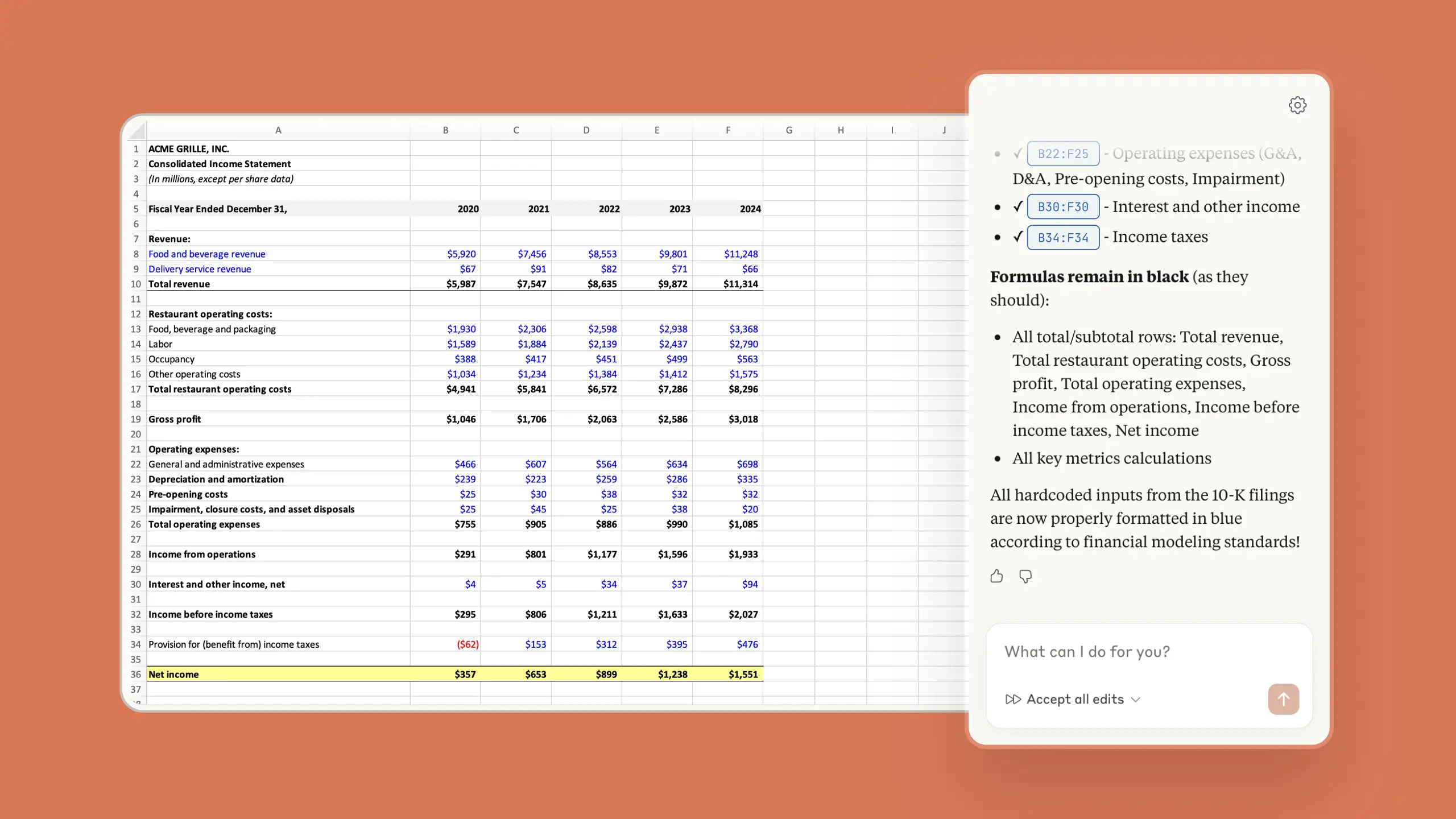 Claude for Excel的核心創新在於情境理解能力。它不只是一個能夠填寫數據的工具,而是能夠: