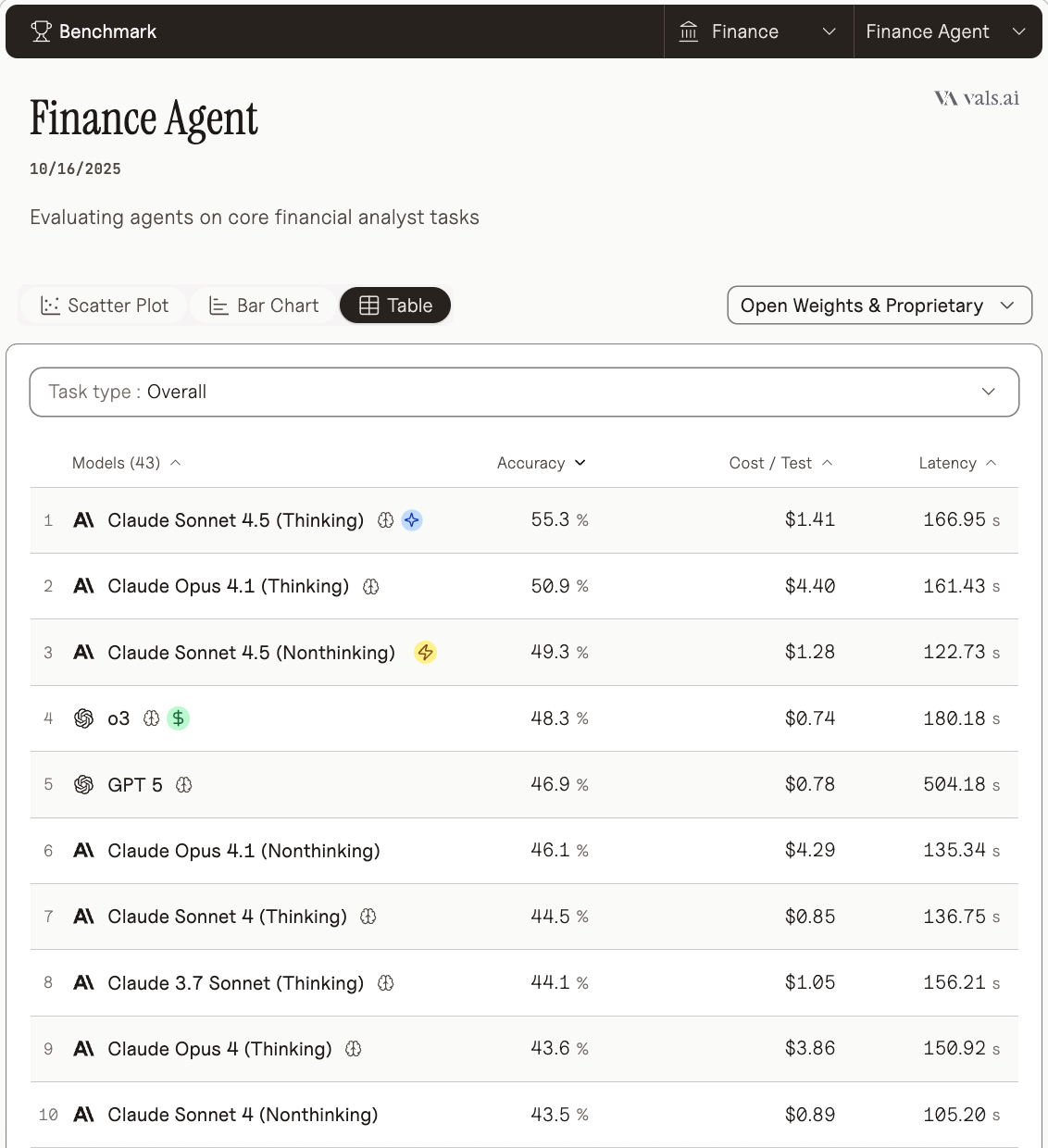 Claude Sonnet 4.5在Vals AI的Finance Agent基準測試中達到55.3%的準確率,被標榜為「最先進」表現。